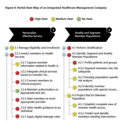 An easily understood tool, called a Heat Map, can be used to communicate an organisation’s capability gaps. Heat maps indicate the level of attention required to address the gap. The heat index is calculated using performance measures along with the value contribution. High heat, illustrated as red, suggests required investment (see Figure 4).