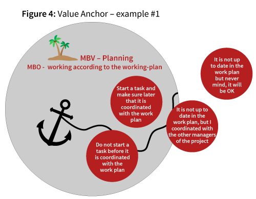 The value anchor space contains behaviours/instructions (MBIs), of an objective (MBO), and of a value (MBV). Figure 4 is an example of a value anchor for developing a team. In this example, the value the team agreed upon is “planning” (which is a pragmatic-economic value); the objective for which they designed the space is “working according the working-plan”. In the value space, they put uncompromising planning behaviours/instructions close to the anchor, things like: “Do not start a task before it is coordinated with the work plan”. This is the expected behaviours/instructions from the team members. A behaviour/instruction that is a bit further away, but still near the anchor, is for example “Start a task and make sure later that it is coordinated with the work plan”. Further out is “It is not up to date in the work plan, but I coordinated with the other managers of the project”. This is at the edge of the space; the anchor rope cannot get further away. Team members should not behave this way. Completely out of the value space, they put the behaviours/instructions “It is not up to date in the work plan but never mind, it will be O.K”. They agreed that they will never behave this way.