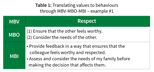 David a manager in a software company, wanted to live his life by the value of “respect” (MBV). He should ask himself: what does it mean to live by this value? What are the objectives (MBO – Managing by Objectives)? In this case, David dismantled the value of respect into two objectives: To live my life in a way that (1) makes sure that the other feels worthy, and (2) sees and takes into account the needs of the other. Now, each one of these objectives needs to be further dismantled into everyday behaviours, answering the question: “What should I do in order to meet these objectives?” As a true example, let’s use the case where David, had to give feedback to a colleague; thus he consciously makes the effort to give the feedback in a way that ensures that the colleague feels worthy and respectful after hearing the feedback. Another example is when David had to take a decision that affects his family. In that case, he considered the needs of his family before taking the decision. Table 1 depicts this example.
