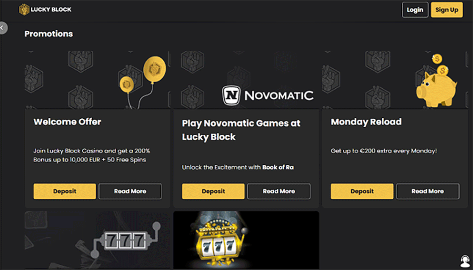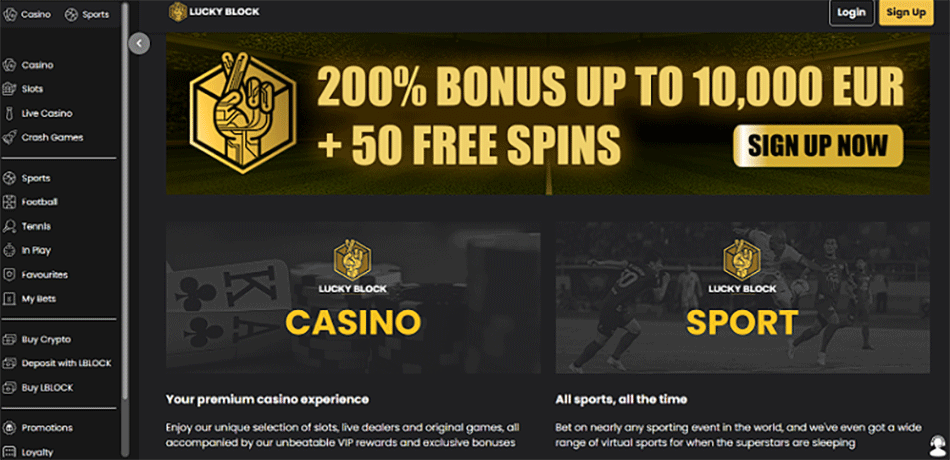 - Welcome Offer: Upon joining Lucky Block Casino, players can claim a generous 200% bonus of up to 10,000 EUR along with 50 Free Spins.