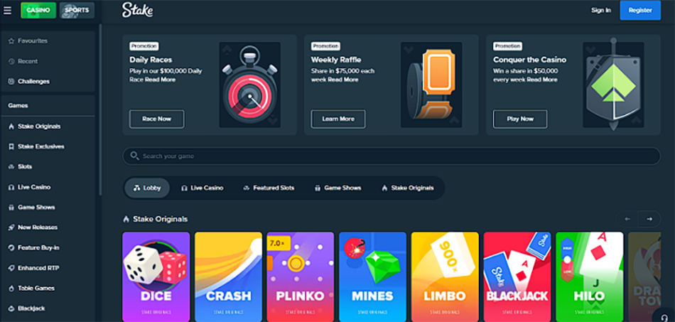 | Stake | Stake is a legitimate online gambling hub with fair services and a stunning collection of slot machines with over 3K games. | $1K daily races |