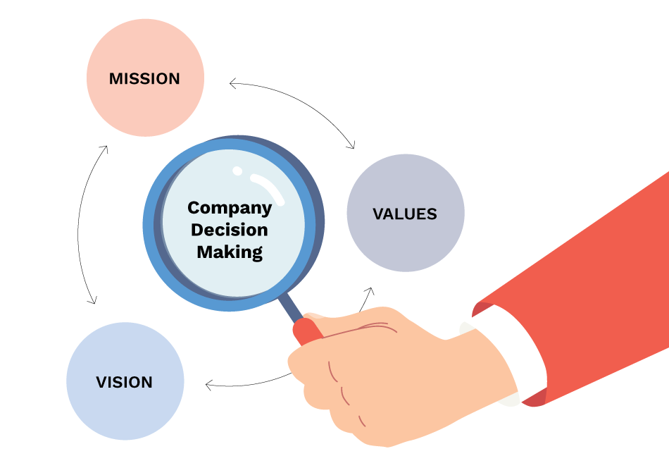 Mission, vision, and values work together to assist in company decision-making. These three directives work together to assist your company in making scalable decisions throughout the organisation.