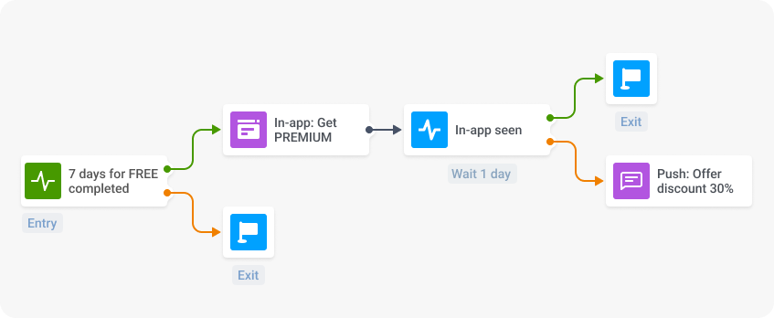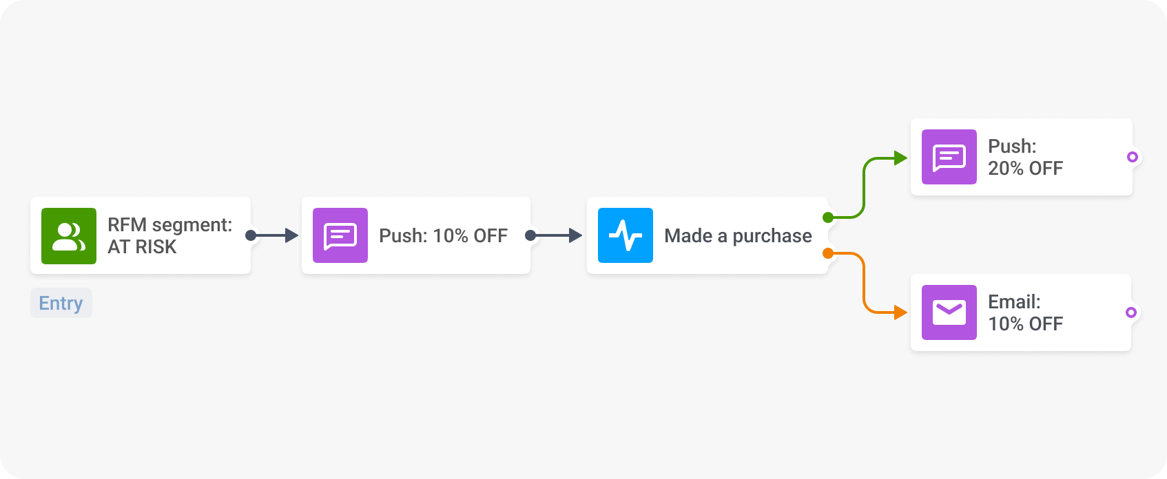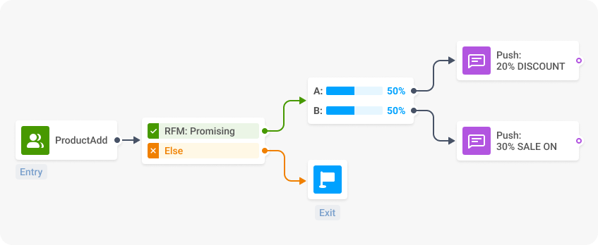 This example is made with Pushwoosh Customer Journey Builder, a tool that helps you map out communication flows and send relevant event-triggered messages to customers at every stage of their lifecycle.