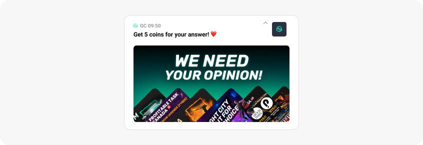 While it’s important to ignite the first spark with compelling offers, you have to keep the flame alive throughout the entire customer journey. You can implement mobile messaging to get customers’ feedback for product and CX improvement. Here is an example from a gaming app that uses push notifications to promote customer surveys: