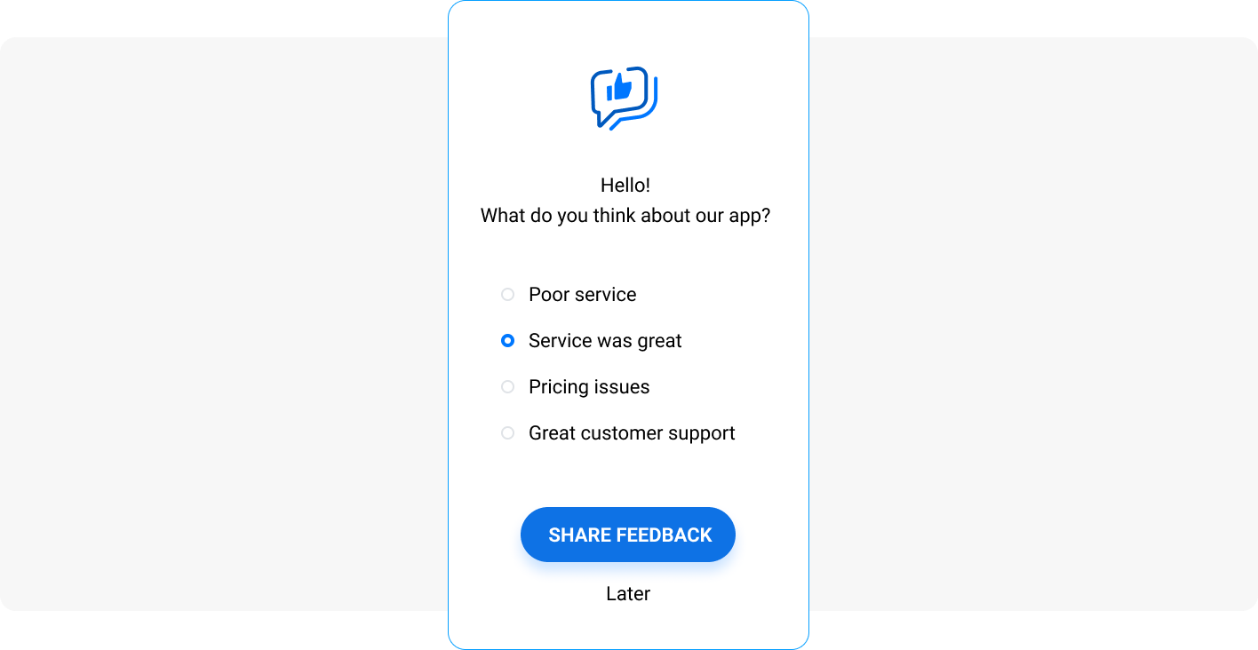 Using in-app messages for feedback collection can make the process even smoother. For example, a single-screen questionnaire keeps customers within the app instead of redirecting (and losing) them to Google Forms or NPS Surveys: