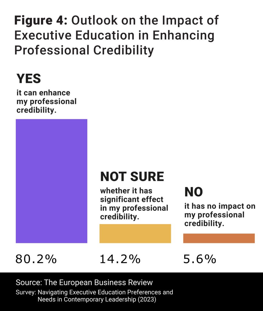 The survey results shed light on the profound impact executive education programs are expected to have on professionals’ career trajectories. Among respondents, 55.3% anticipate that executive education will significantly enhance their leadership skills, recognizing it as a pivotal driver of career advancement. Additionally, majority of the respondents at 80.2% prioritize the importance of executive education in enhancing their professional credibility among their peers, underscoring its role in fostering valuable connections crucial for success in today’s competitive landscape. One respondent highlighted the networking opportunities, stating, “It would expand my social and professional network; I would be able to connect and meet other people in my field which can enhance my opportunities in the future.” Active participation in executive education was seen as a means to enhance relationships with industry experts, with one respondent noting, “Active participation in executive education enhances my relationship with industry experts.”