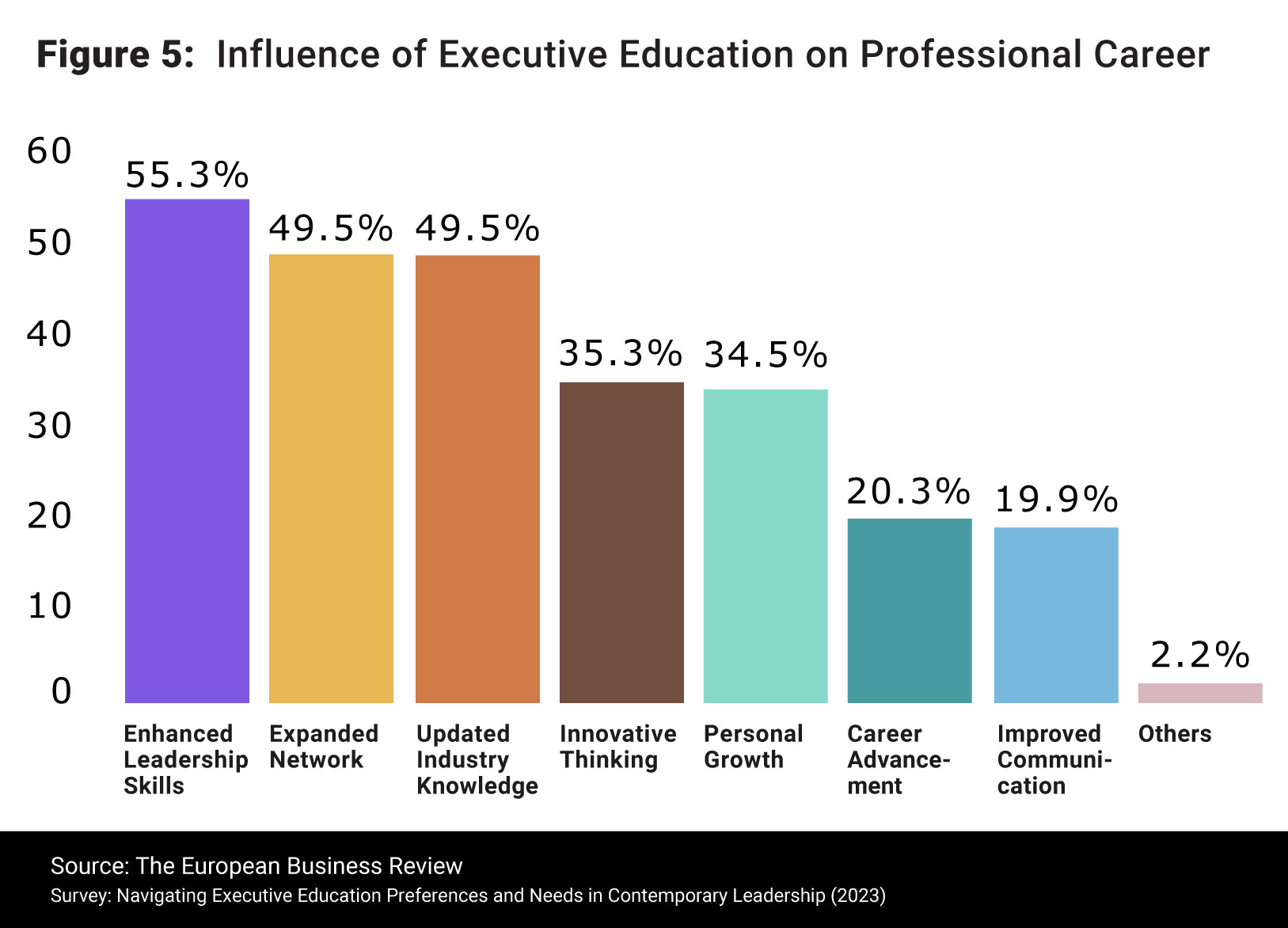 An equal percentage of respondents, also at 49.5%, express the expectation that executive education programs will provide them with updated industry knowledge, highlighting the significance of staying abreast of the latest trends and developments in their respective fields. Others highlighted the value of mentorship and gaining insights into effective management practices, as one respondent expressed, “Mentoring about how to set a company and managing virtual teams.”