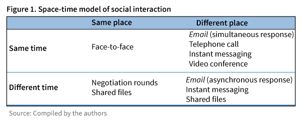 Online communication mechanisms can be organised according to the level of expressivity that the language reaches in them, which depends on the capacity of the medium to communicate with a greater or lesser degree of detail, based on the signals that it includes. Face-to-face negotiation is the transmission method with the highest level of signals (since it includes both verbal and non-verbal communication), while emails are more limited in this regard. On the temporal plane, a second dimension is in the interactivity of the medium, which captures the level of synchronicity of the interactions or the extent to which the individuals work on the same activity at the same time. In face-to-face negotiation, phone calls, video conferences and chats, the interaction is synchronised, since the communication between the two parties is synchronous. Conversely, in negotiation via email, the communication is asynchronous, since you can reply later or whenever you find it convenient.