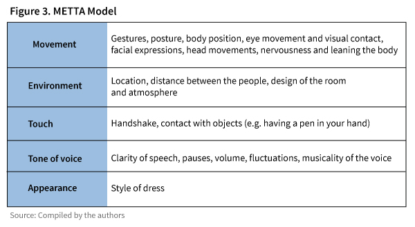 On average, an executive receives more than one hundred and fifty emails a day3, covering everything from the most trivial to the most important issues. This constant updating in the face of a major data flow makes many feel that their emails are not read carefully and they initially attribute less trust to the counterpart. Trust, therefore, in comparison with face-to-face negotiations, is lower both in the preparation phase of the negotiation and in the post-negotiation period, which means that long-term relations are less probable (Ebner, 2013). These lower expectations of collaboration are mainly due to the lack of non-verbal communication signals, characterised, according to the METTA model, by movement, environment, touch, tone of voice and appearance (Thompson, 2015), which naturalise the relationship in the negotiation (see Figure 3).