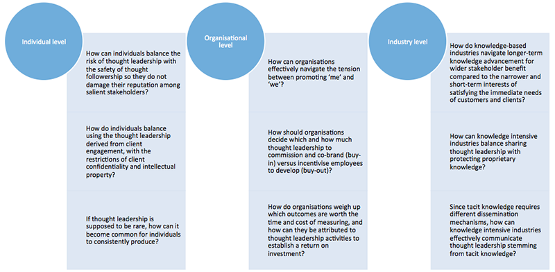 Today, many organisations have a head of thought leadership and thought leadership industry awards. Here we identify nine such difficulties which such organisations face, and organise them according to where tensions can lie at the individual, organisational and industry level (see inset).