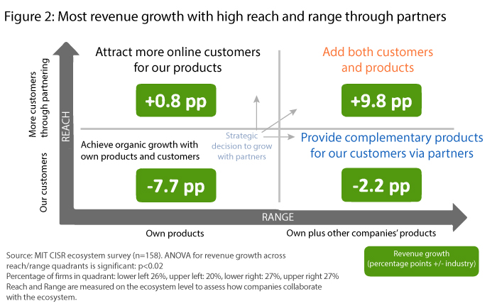 1. MIT CISR ecosystem survey 2017, n=158. The combined regression of reach and range with revenue growth is significant (p=0.015).