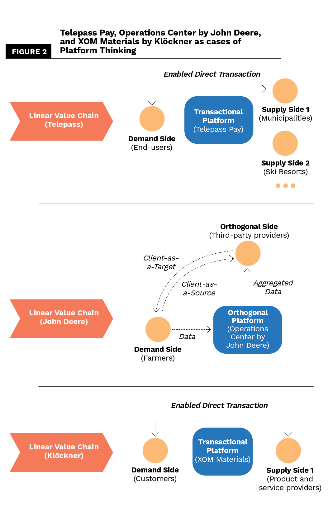 With the concept of “Platform Thinking“, we refer to the ability to foster innovation by seeing possible platform mechanisms everywhere. It might seem strange but, once unlocked, the platform way of thinking can foster innovation even in established, industrial, non-digital companies, as in the cases of Telepass (Italy), John Deere (USA), and Klöckner (Germany).