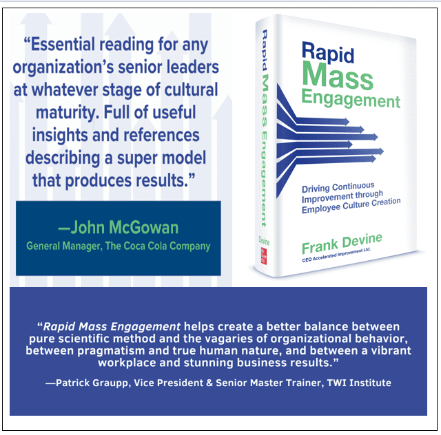“The belief that culture change must be slow is one of the most damaging myths of UK leadership,” Frank Devine states, founder of Accelerated Improvement. The conversation around culture change has stalled. In today’s volatile environment leaders do not have the luxury of multi-year culture programs, they need a method that delivers momentum quickly. Traditional HR language, such as “employee voice,” “involvement,” and “engagement initiatives,” has become synonymous with slow progress and disappointing impact. The Rapid Mass Engagement (RME) process rejects that model entirely. “Real progress happens when employees have the authority to diagnose and prioritise the issues preventing organizations achieving their goals. Instead of organisations trying to sell or “push” improvement top down, this approach creates employee “pull” or desire for improvement.”