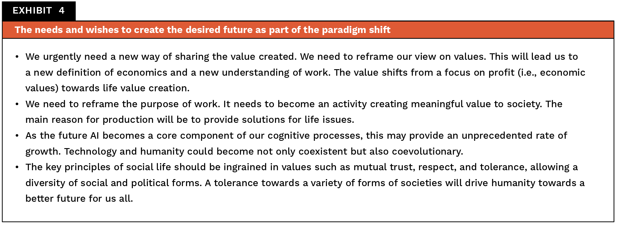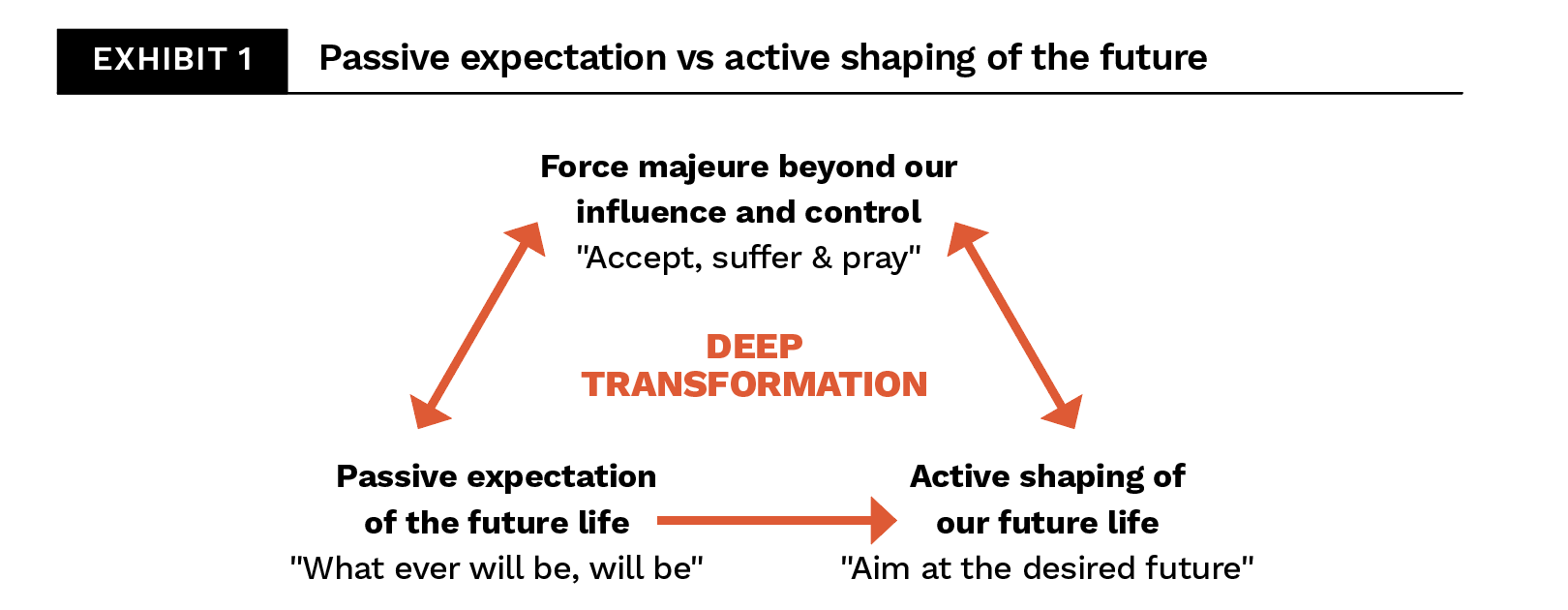 The transition from the industrial age into the cyber-age is a huge challenge, but also a unique opportunity for enterprises and corporations. To participate in this development, we need foresight, the right education, the necessary technological infrastructure, and ample entrepreneurial spirit. A multi-reality world in transition requires permanent focus on the actual, the emerging, and the future context. It also requires permanent awareness about contextual changes and future orientation. In a world in transition, we need a process focused on the desired future and not just on the expected one. Businesses that keep on focusing overwhelmingly on past successes have no future. Tomorrow, everything may change. The passive expectation vs active shaping of the future is depicted in exhibit 1.