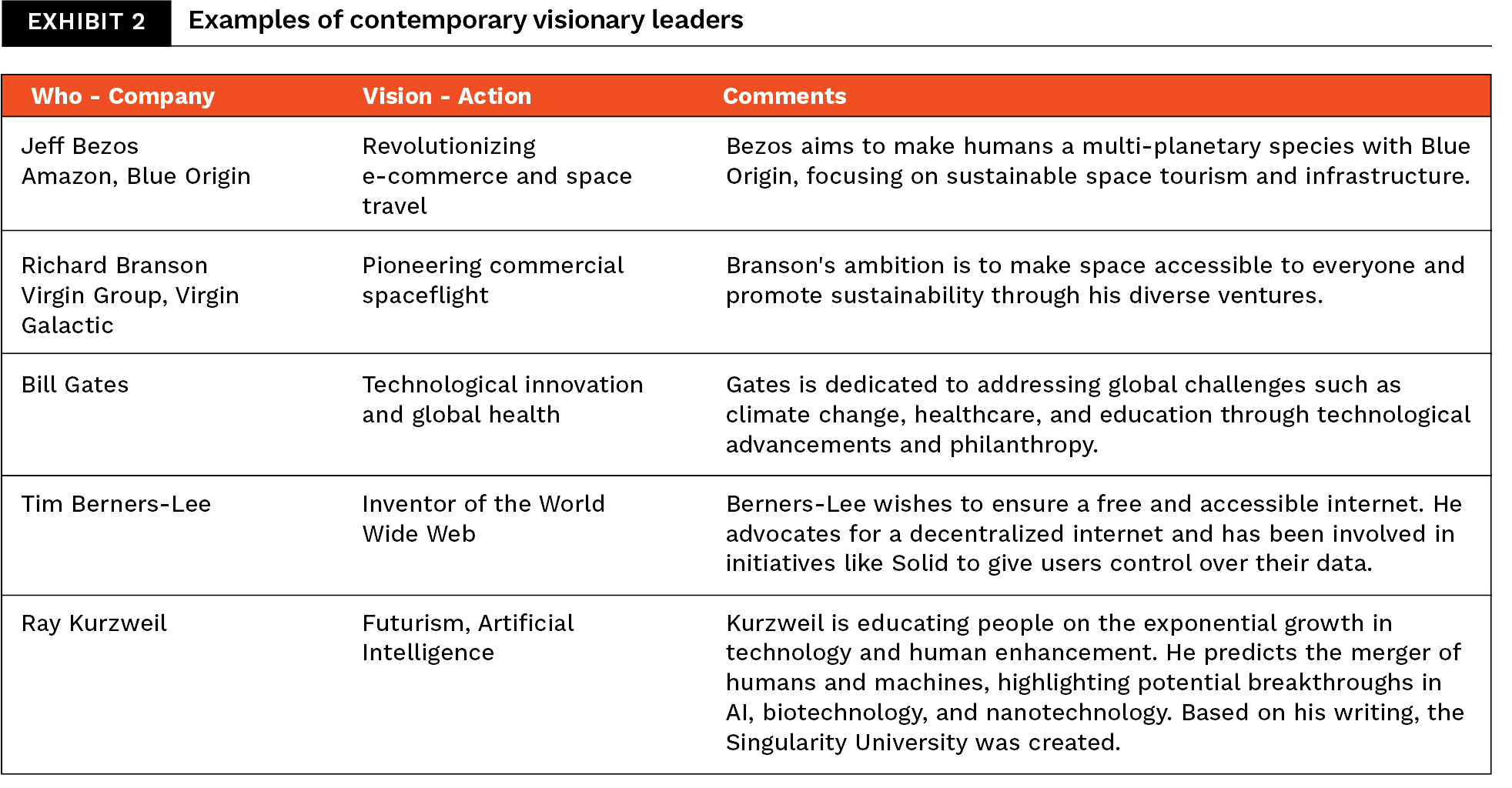 Hope is a key value that may help leaders to avoid the worst-case scenarios and focus on future vision. Simply spreading optimism seems to be futile; what is needed are real visionary leaders who engage in action. Fortunately, these exist. Exhibit 2 proposes some examples of visionary leaders who are transforming the landscape and preparing for the future. These individuals are not only visionary in their thinking but also actively working to implement their ideas and drive progress in their respective fields.