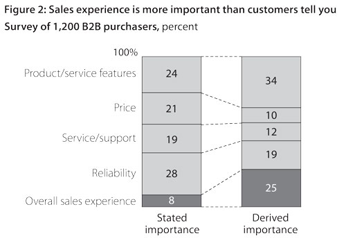 In a survey, McKinsey asked 1,200 B2B purchasers what drove their purchasing decisions. “Overall sales experience” emerged as the least important category. We then asked the same customers to rate their suppliers’ performance and also asked for each supplier’s share of their business. Correlating supplier performance with actual purchases revealed a startlingly different picture: sales experience was three times more important than stated. (Figure 2)