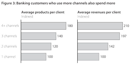 Yet few companies have truly mastered multichannel sales, even though the payoff can be tremendous: companies that get it right generally enjoy larger profit margins and revenue growth. For example, in banking, product penetration and revenue per client can be about twice as high when customers are served across more than four channels, compared to customers that are served only through one channel. More generally, recent McKinsey research shows that consumers who shop across a number of channels—physical stores, online, catalogs—spend about four times more annually than those who shop in just one. (Figure 3)