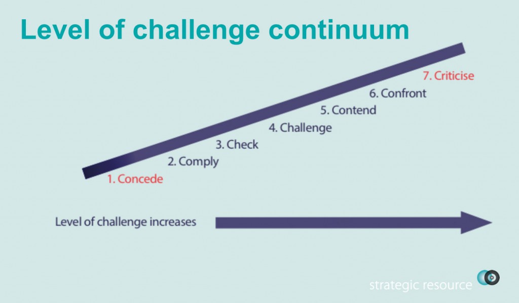 The challenge continuum is a useful yard stick for self-assessing your senior team. Just as in the fifteen minute exercise above, ask your colleagues to say where they think the level of challenge has been, on average, over the last 3 months. The difference on this continuum is that there is a preferred level. You need to be able to be at 4 (challenge) and 5 (contend) on the key strategic issues, otherwise decisions will not be robust enough. “Contending” is perhaps a word that needs unpacking. It means I have a clear view on what we should do next, and so do you. We start from the assumption that the best solution will be a synergy of both our views, rather than one person “winning the argument” or, some sort of mucky compromise. So, rather than working to pull you over onto my side, I seek to understand why you, experienced professional that you are, see it differently from me. I don’t back down from my view but I give yours a damn good listening to. And you do the same with me. If we both do this cleanly, in a distress free way, the solution that gets forged through the heat of our strong debate will be better than the one either I or you had in mind before we started.
