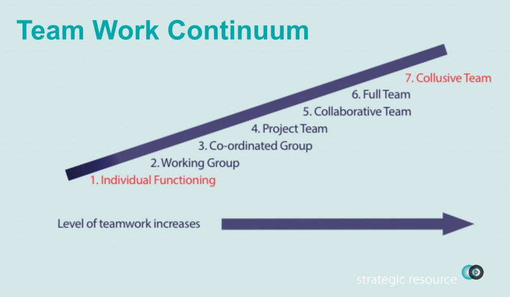 Gratuitous team work means attempting to keep the level of team work at 4-5 all the time, irrespective of the need, and is to be avoided at all costs. Much time is wasted in business by the notion that we “must be a team”. Only be a collaborative team when you need that level of team work to achieve your strategic objective.