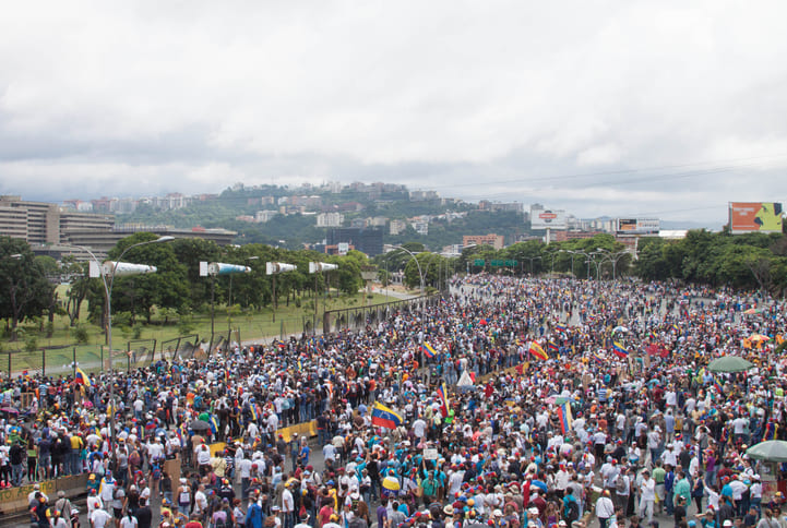 On Monday evening, thousands of people flooded central Caracas as protests erupted in the Venezuelan capital the day after President Nicolás Maduro was confirmed to have won Sunday’s election.