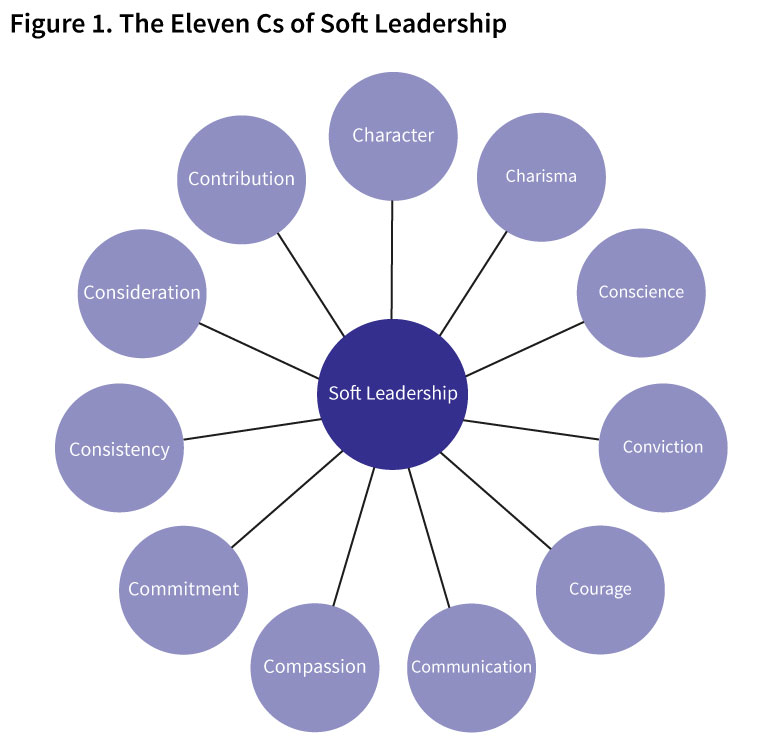 Soft leadership is a people-oriented leadership without compromising the task-orientation. It is to accomplish goals and objectives through persuasion, not through pressure. It is to lead with soft skills and people skills. It blends soft skills, hard skills, and leadership. It emphasises the significance of precious Human Resources. It helps in managing the emotions, egos, and feelings of the people successfully. It focuses on the personality, attitude, and behaviour of the people, and calls for making others feel important. It is an integrative, participative, relationship, and behavioral leadership model adopting tools such as persuasion, negotiation, recognition, appreciation, motivation, and collaboration to accomplish the tasks effectively. Succinctly, soft leadership can be defined as the process of setting goals; influencing people through persuasion; building strong teams; negotiating them with a win-win attitude; respecting their failures; handholding them; motivating them constantly; aligning their energies and efforts; recognising and appreciating their contribution in accomplishing organisational goals and objectives with an emphasis on soft skills. It is based on the right mindset, skill set, and toolset. Here is the diagram (Figure 1) connecting 11 Cs that collectively constitutes soft leadership.