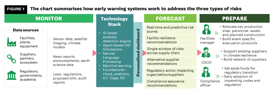 With that in mind, we offer a primer. Specifically, we explore, below, how EWSs can guide leaders’ actions to offset facility, supply chain, and regulatory risks of climate-related events in the short term, with wide-reaching sustainability implications over the longer term.