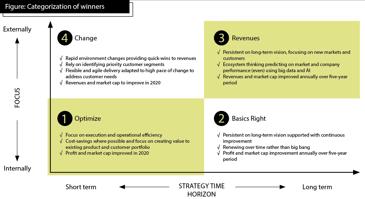 Our analysis shows that winners can be categorized in four groups depending on company’s focus and time horizon of strategic actions (see Figure).