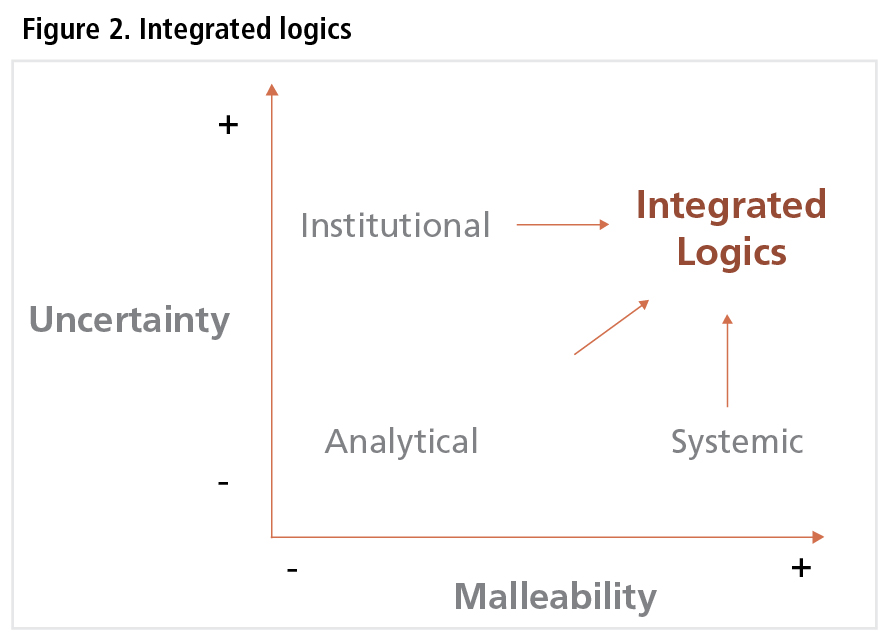 In order to deal with this progressive increase in uncertainty and malleability, some authors10 propose a contingent solution where different ways of making strategies are used, depending on the environment encountered. Following this principle, we would say that analytical logic is appropriate for stable environments, institutional logic for uncertain environments and systemic logic for malleable environments. The reality, however, is somewhat more complex and, although this contingent approach may be useful in the short-term, in the medium and long run it has considerable limitations.