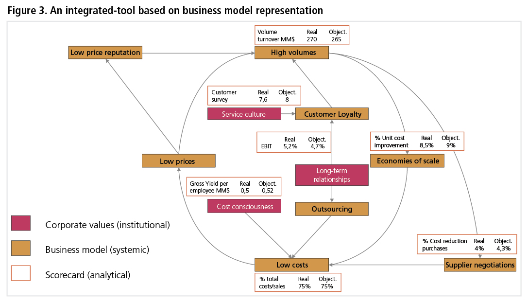 As an example, we present below an integrated tool of a company that combines a low cost business model with a strong culture based on customer service (Figure 3 below). This tool is based on the design model of Casadesus-Ricart,13 extended to the representation of the corporate mission and values, combined with the balanced scorecard. As a result of this integration, we obtain a tool that enables us to see to what extent the various business model hypotheses are consistent and reinforced by the institutional principles of the company. Simultaneously, through scorecard indicators, we can see the degree in which these hypotheses and principles fit the reality of the numbers. In turn, as it is a dynamic tool (using indicators that are constantly evolving), it facilitates and stimulates the periodic reflection of both business models and institutional principles.