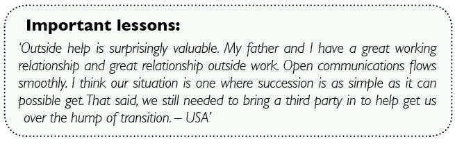 Seek your succession advisor wisely and allow them to work with your existing taxation and legal advisors so as to achieve the best blend of succession expertise and knowledge of both your business and family.