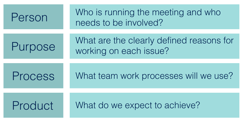 Of all the models I have developed in my 25 years of consultancy work, to date, this is the most straightforward and the most impactful. Whenever you are about to engage in meetings, or any form of teamwork, it pays to set out the 4 P’s.