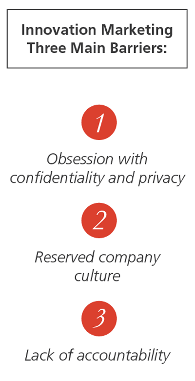 • Obsession with confidentiality and privacy. Some companies, particularly those active in IP-sensitive industries, such as chemicals, are worried about breaches of confidentiality. Worry becomes paranoia and all the good things they are doing are automatically categorised as confidential, even when they are not sensitive. We have regularly met companies that have turned down the opportunity to be a case study for Harvard Business School or another leading business school. This is often self-defeating. The perceived risk of divulgating ‘confidential’ information to the external world hinders effective innovation marketing beyond the company.
