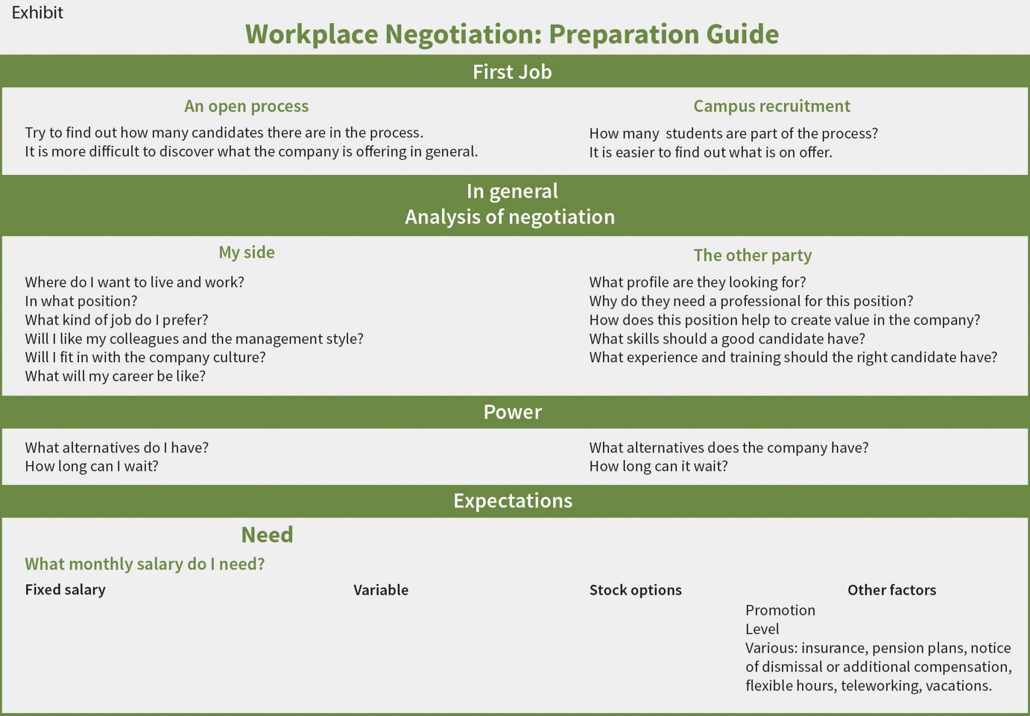 Experience has shown that, sometimes, when MBA students are having their first job interviews and are faced with the question about their salary expectations, they tend to make two fundamental mistakes: they either lie or they try to avoid the question. A job interview is a conversation, and any conversation has to be fluid if the participants are to achieve their goals. Bypassing a question cuts off the flow and, in turn, the desired effects of the conversation. So, rather than avoiding the question, it is better to understand it. To gauge the scope of the question, there are two important things to be aware of: 1) How will the possible answers affect my position in the negotiation? and 2) Why is the interviewer interested in this information? Often, thinking about these two aspects on the spur of the moment can be hard. That is why it is useful to prepare your responses to these questions ahead of time. In the Exhibit, a preparation guide for salary negotiations is suggested.