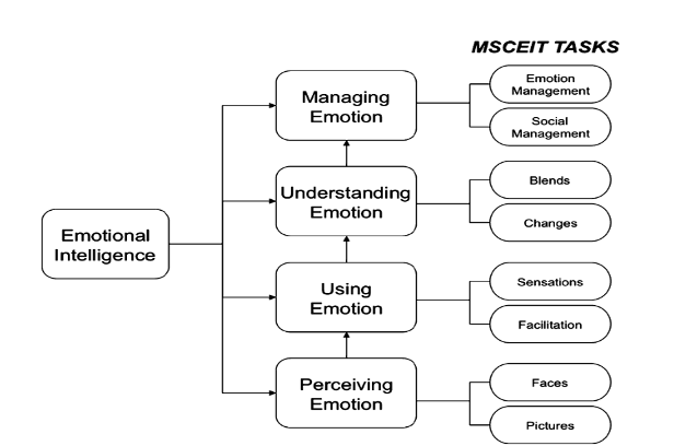 There are different performance tests that measure different components of emotional intelligence. For instance, one of them is the Diagnostic Analysis of Nonverbal Accuracy Scales (DANVA and DANVA-2; Nowicki & Duke, 1994). Elsewhere, this and other measures have been described in detail (Brackett & Geher, 2006. A comprehensive performance test of emotional intelligence is the Mayer-Salovey-Caruso Emotional Intelligence Test (MSCEIT; Salovey et al., 2002) for adults and the Mayer-Salovey-Caruso Emotional Intelligence Test, Youth Version (MSCEIT-YV; Mayer, Salovey, & Caruso, 2005) for adolescents (12-17 years). They require individuals to solve tasks related to each of the four abilities that’s why these are considered performance tests (Mayer, Salovey, Caruso, & Sitarenios, 2003). The adult version of the MSCEIT has eight tasks as shown in the figure below.