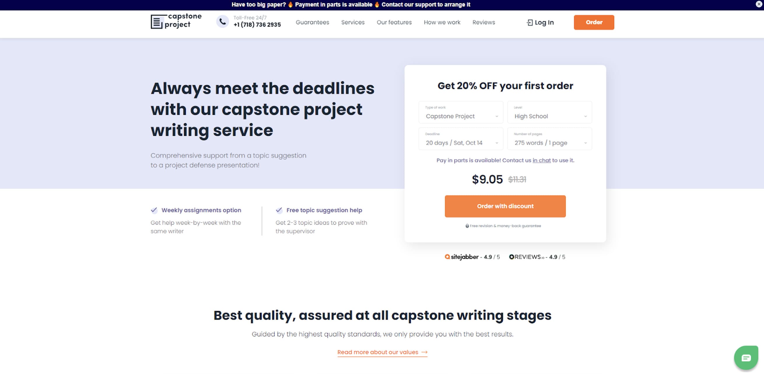 Capstoneproject.net service knows well all the problems that modern students may face and does its best to minimize maximum hassles related to working on capstone projects. In addition to strict adherence to customers’ deadlines, they develop personalized approaches to every client, meeting their needs 100%. Despite the vast writing experience and a constantly growing base of clients, they do not hammer prices for capstone project services to the ceiling; on the contrary, they offer flexible tariffs and a welcome 20% discount for newcomers.