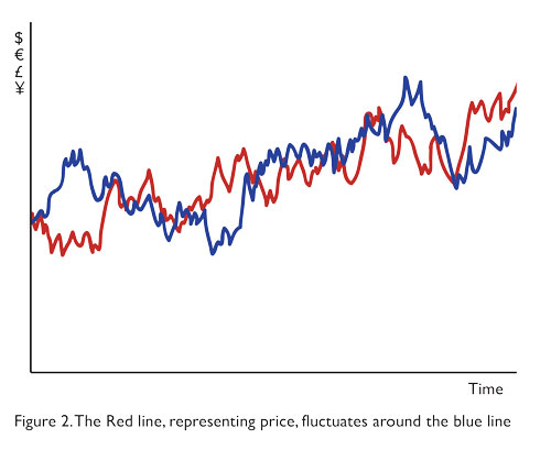 The red line depicts the movement of stock price over time. Although we cannot know this with absolute certainty, we expect the red line to fluctuate around the blue. As deviations between value and price get larger, savvy investors on the lookout for mispriced securities will take appropriate action. If shares appear seriously overpriced, they sell or even short; if the reverse is true, they buy. The practical effect of these actions is to tether share price to the blue line. The size of the tether that separates the two lines (i.e., the extent to which shares can be mispriced) is a function of market efficiency, how widely the shares are held, the number of analysts tracking the company, and so on. The extent of the mispricing, therefore, is likely to be far less for a global giant like Procter & Gamble than for a small biotechnology firm.