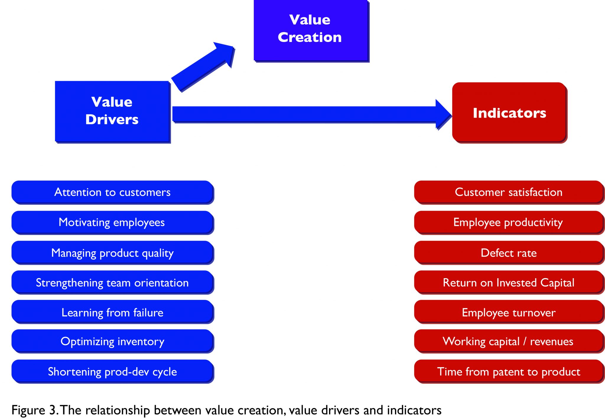 At corporate level, much of red-line behaviour is motivated by the desire of senior managers to finesse share price. However, similar thinking can occur at any level of an organisation, principally through the misuse of KPIs. As shown in Figure 3, the objective of value creation is achieved though actions and behaviours commonly known as value drivers. These drivers are the behaviours and actions that truly drive business success. Examples include motivating employees, relationships with customers and suppliers, the positioning of equipment and machinery in factories, and so on.