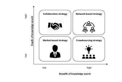 The open innovation design of a company may vary in both “breadth” and “depth” of knowledge search. This is illustrated in figure 2. Breadth signifies the diversity of a company’s external sources, often defined as the number of different types of external parties involved. Depth signifies the level of intensity with which the company deals with external sources, defined by how deeply the firm integrates external parties into the innovation processes.6