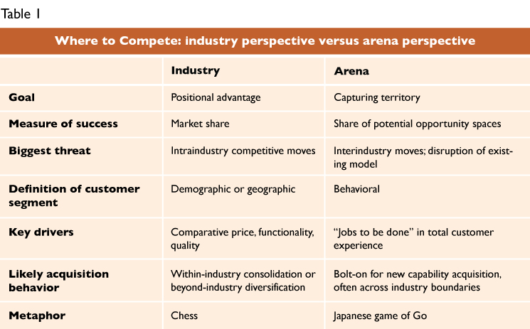 It isn’t that industries have stopped being relevant; it’s just that using industry as a level of analysis is often not fine-grained enough to determine what is really going on at the level at which decisions need to be made. A new level of analysis that reflects the connection between market segment, offer, and geographic location at a granular level is needed. I call this an arena. Arenas are characterized by particular connections between customers and solutions, not by the conventional description of offerings that are near substitutes for one another.