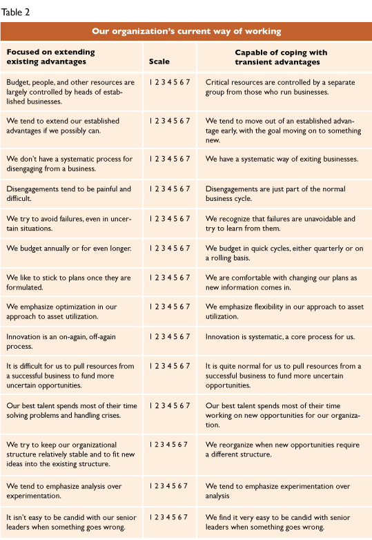 Good companies can be trapped into aging advantages and be surprised when things change. The diagnostic in table 2 can help pinpoint areas in which you might be at risk of being blindsided and suggest changes that you might want to make. Simply position your organization’s current way of working on the scale between the two statements in the assessment. Those areas that fall to the left of the scale are the ones you might want to take a good hard look at.