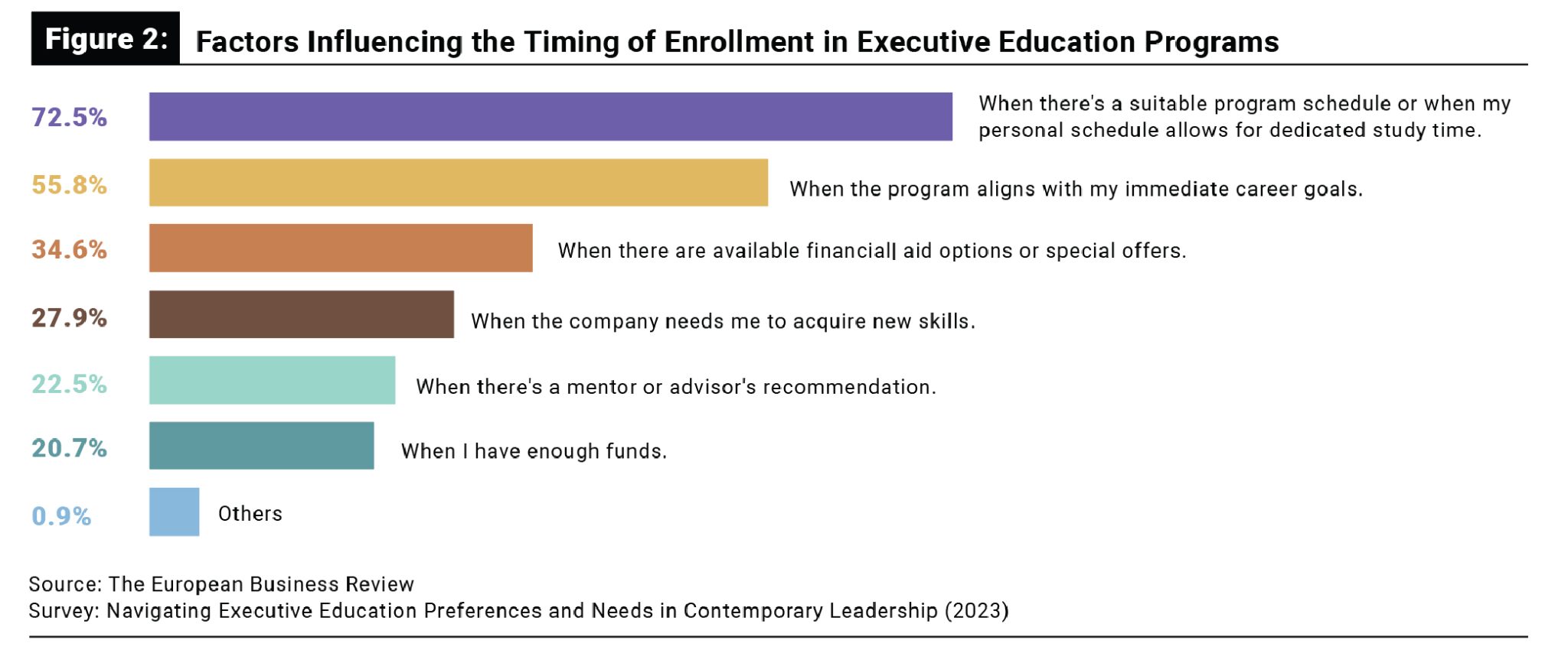 Institutions must also remain agile, adapting to emerging trends to deliver impactful executive education experiences. The survey results also shed light on participants’ decision-making process regarding the timing of commencing an executive education program. A significant majority (72.5%) prioritize a suitable program schedule or personal study time availability, underlining the importance of flexibility in program timing. Over half of respondents (55.8%) consider program alignment with immediate career goals as a crucial factor, while financial considerations also play a significant role, with 34.6% indicating the availability of financial aid options or special offers as influential in their decision-making. Additionally, organizational needs drive decisions for 27.9% of participants, highlighting the importance of professional development in the workplace. While mentor or advisor recommendations (22.5%) and personal financial readiness (20.7%) are less frequently cited factors, they still carry weight in participants’ decision-making processes.