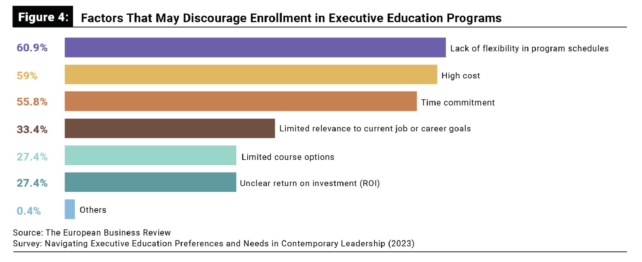According to the survey results, a significant portion of respondents expressed concerns about the lack of flexibility (60.9%) in program schedules, indicating that this factor might discourage them from enrolling in executive education programs. This underscores the importance of flexibility in accommodating professionals’ busy schedules and commitments. Additionally, 59% of participants highlighted the high cost associated with executive education programs as a potential deterrent. This underscores the significance of affordability as a determining factor in the effectiveness of different formats.