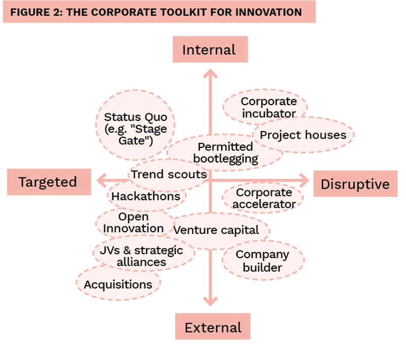 Based on our research and qualitative interviews with corporate decision-makers and executives working in innovation management in large, medium, and small companies, we have identified the main tools and mechanisms of how executives can organize innovation. Using the two dichotomies described above, we suggest a “Corporate Entrepreneurship Matrix” that helps to categorize and balance innovation efforts along the two dimensions “internal/external” and “targeted/disruptive.” Starting from the top left quadrant, we will present our findings on targeted innovation, and then switch to disruptive innovation.
