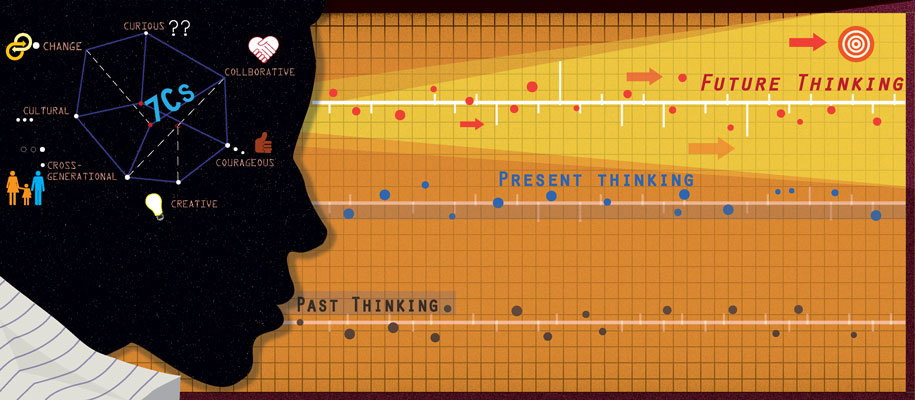 So, based on our findings to date, what are the characteristics we need to adopt to ensure new, stretched, future-friendly forms of leadership? We asked 500 expert respondents what qualities enable thinking and acting on stretched time-scales. When we crunched the numbers, strong patterns began to emerge—and, ultimately, seven key themes surfaced. Our respondents suggested that high-FQ leaders know how to navigate what we call the 7Cs. So, among other things, they: