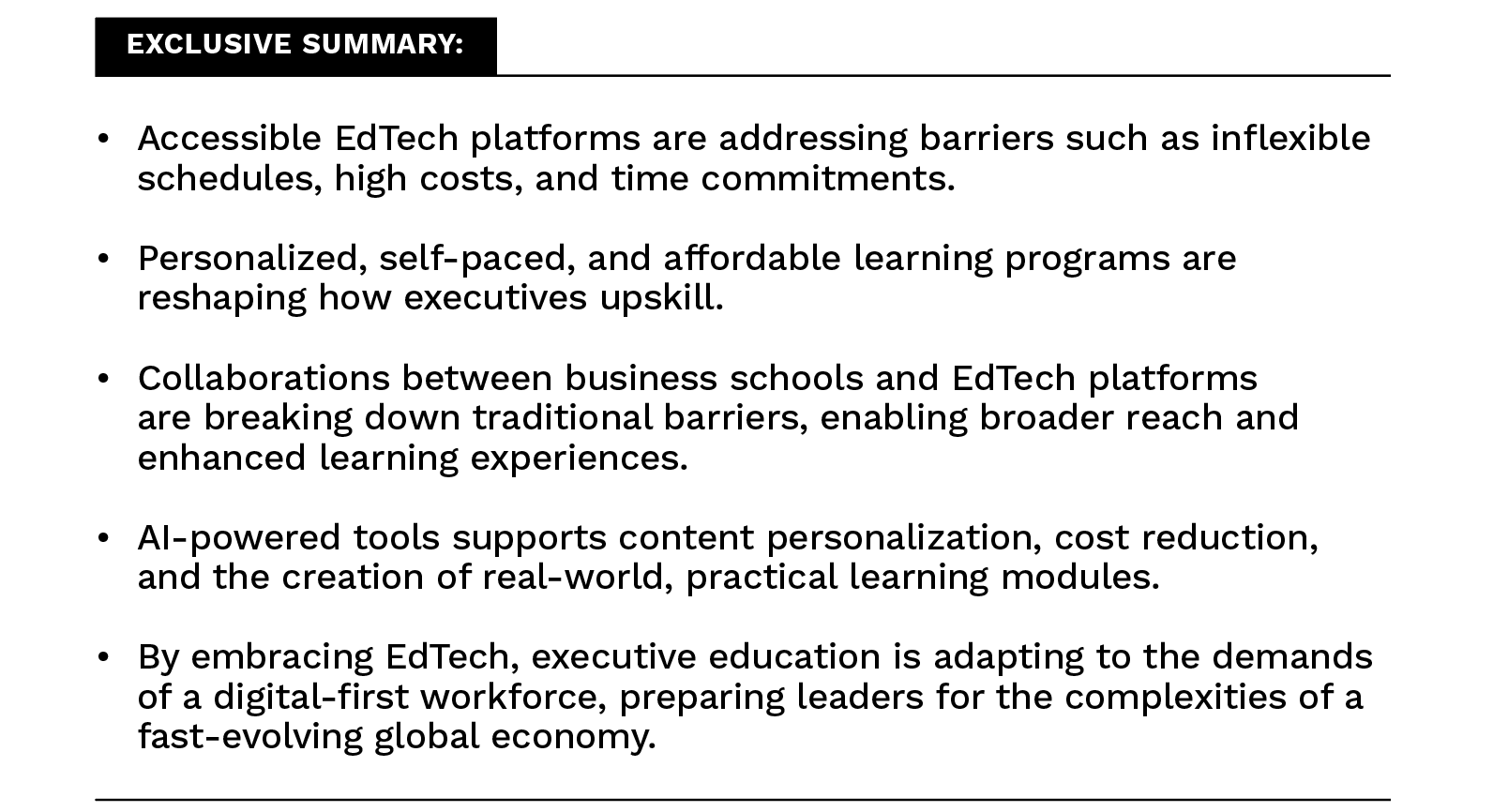 The evolution of education technology (EdTech) is reshaping executive education in ways that were unimaginable just a few years ago. EdTech is not only enabling business schools to reach a broader audience but is also making learning more flexible, accessible, and adaptive to the ever-evolving demands of the global workforce. Executive education, once limited by location, high costs, and rigid structures, is now moving toward more inclusive, scalable, and efficient delivery methods through digital solutions.