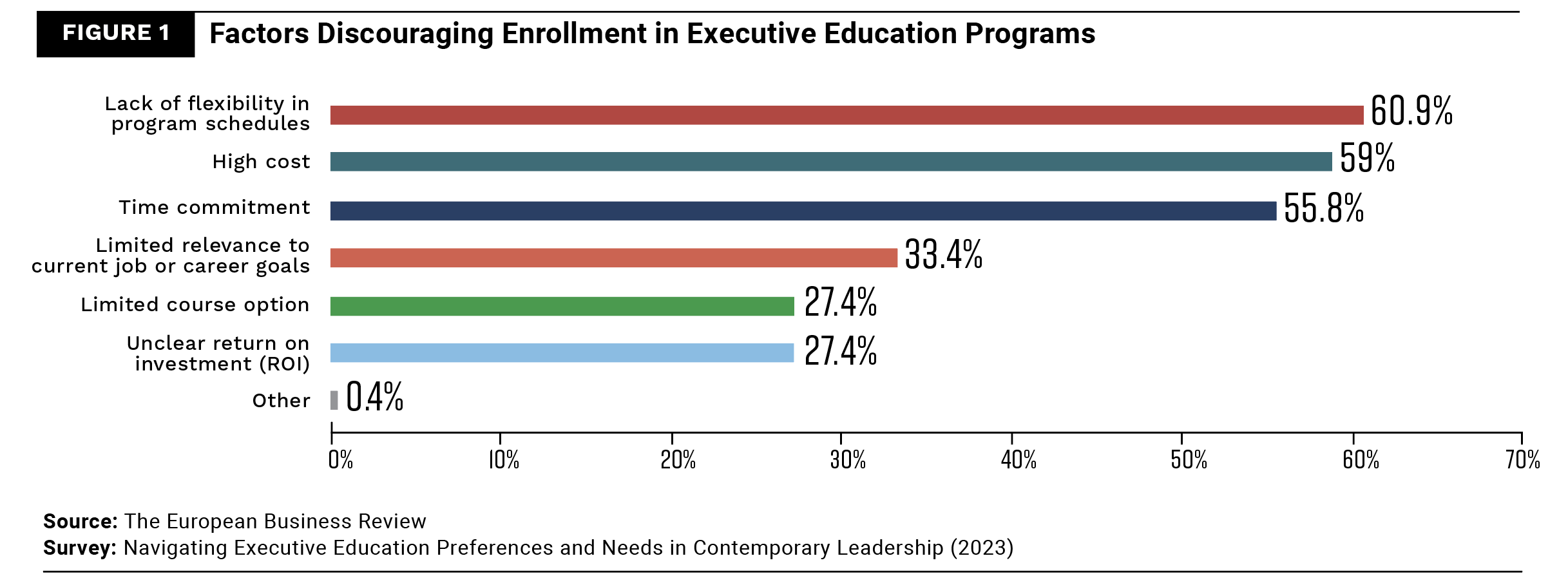 EdTech platforms have disrupted traditional education models, allowing executives to pursue personalized, on-demand learning that fits around their busy schedules. Our survey respondents cited several barriers that discourage enrollment in executive education programs: lack of flexibility in program schedules (60.9%), high costs (59%), and significant time commitments (55.8%). Other concerns included limited relevance to current roles (33.4%), limited course options (27.4%), and an unclear return on investment (27.4%).