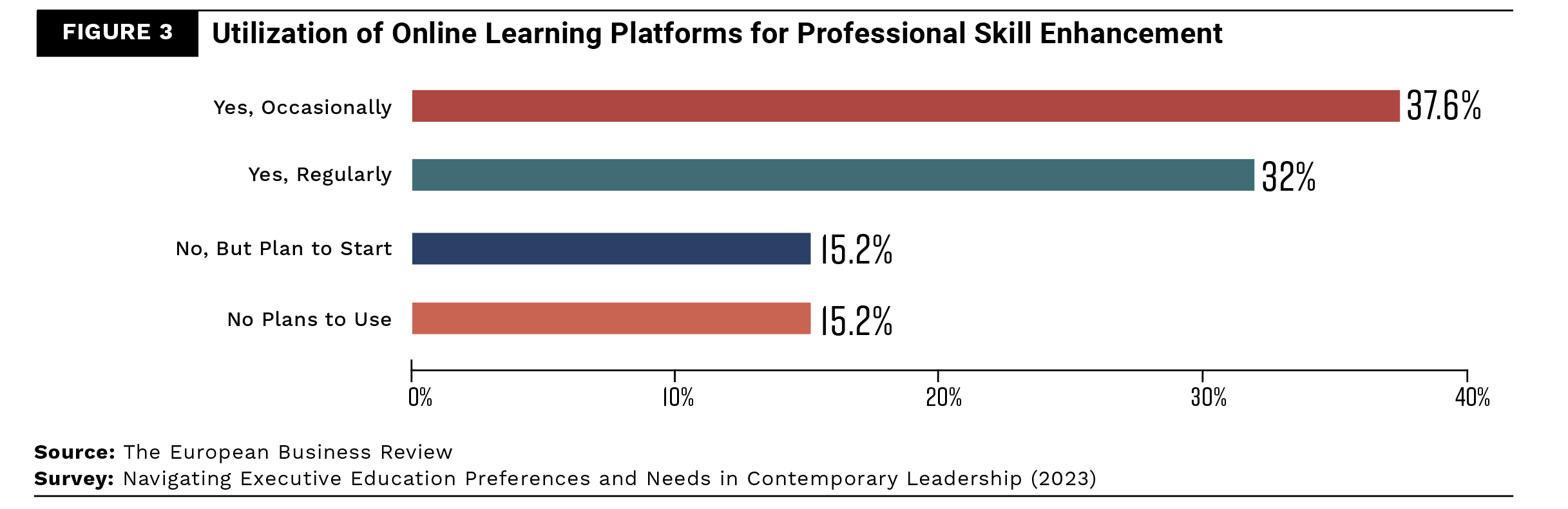 Many business schools now see EdTech platforms as essential partners, helping them reach a wider audience and deliver valuable content to executives. Schools leverage these platforms to create programs that are flexible and accessible, breaking down the traditional barriers of time and place. In our survey, we found that 37.6% of respondents occasionally use online platforms for professional development, while 32% use them regularly. This high level of engagement demonstrates the critical role these platforms play in continuous learning for executives.
