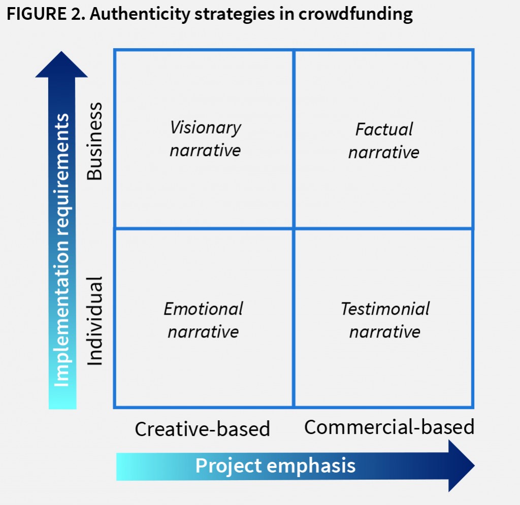 Authenticity comes in many forms. Figure 2 shows the optimal authenticity strategy based on project emphasis and implementation requirement. Creative projects demonstrate authenticity by linking the outcomes to the entrepreneur’s vision and emotions. Commercial projects, which look more like traditional ventures, should emphasise facts and demonstrated team competencies. Authenticity should also reflect the implementation requirements of the project. If the project will require organisational structure, the campaign authenticity requires a specific vision and facts to support it. If the project will effectively be a one-person show, then authenticity derives from the entrepreneur’s demonstrated emotional commitment. The “wisdom of the crowd” resides in rapid assessment of authenticity rather than assessment of project potential. The most valuable currency in a crowdfunding campaign is an authentic narrative tailored to project scope and scale.