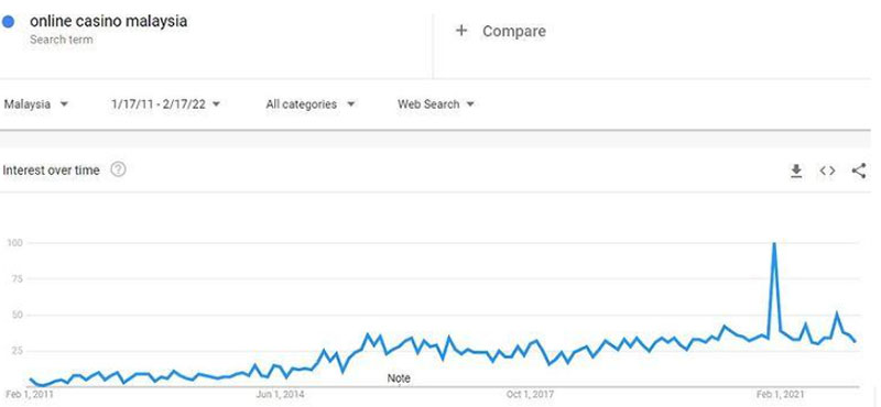 Malaysians love to gamble in online casinos. If you check the image below you see that the rise of the search term “ online casino Malaysia” from 2011 to present day has increased by more than 2500%!