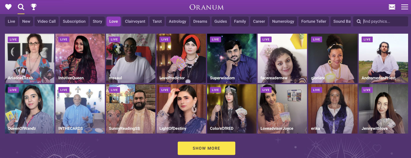 Unlike other platforms that focus on chatting, Oranum provides its main types of online psychic readings by phone or video calls. Users can find the best experts for an online psychic reading session by looking through the top 100 or applying search filters and adding them to the favorites list. There are also pre-recorded videos from experts to feel a person better. Another reason to prefer Oranum is generally lower rates and rewarding bonuses to new members!